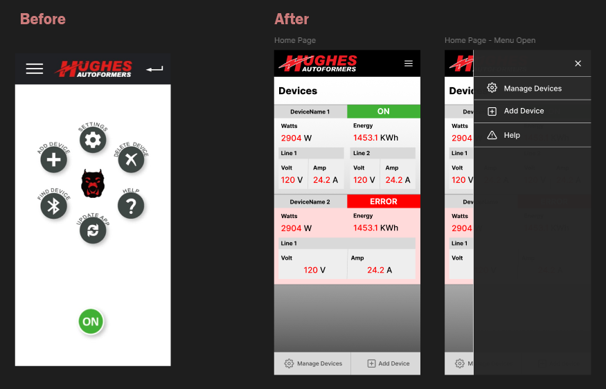 My redesign replaces this menu with a card-based "Devices" view that surfaces information immediately upon opening the app. By moving to a scannable list, I've prioritized the most critical metrics—real-time wattage, energy usage, and line status—while using clear, color-coded indicators for "ON" and "ERROR" states. This shift reduces the time-to-info from a multi-step process down to a single glance.
