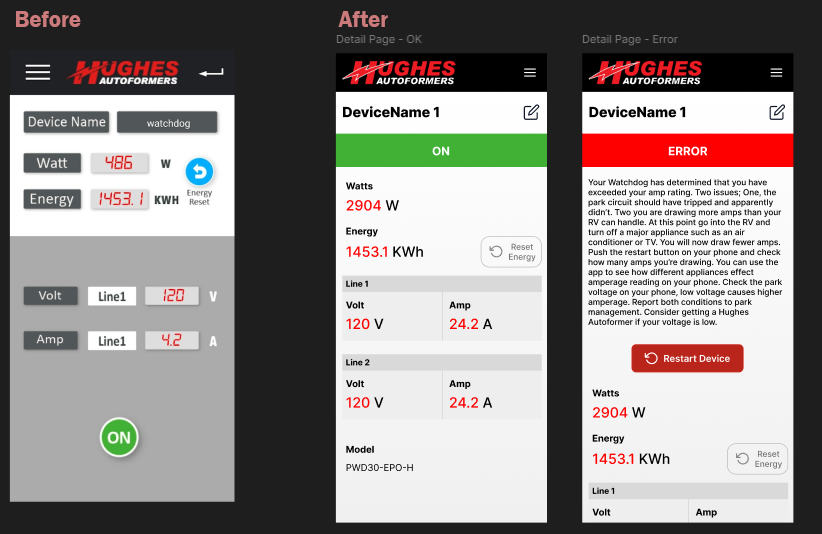 Persistent Error States: Instead of an automatic, silent restart, the app now maintains the error state, providing a detailed explanation of the issue (such as exceeding amp ratings). This allows the user to identify and fix the electrical problem before manually triggering a Restart Device action.