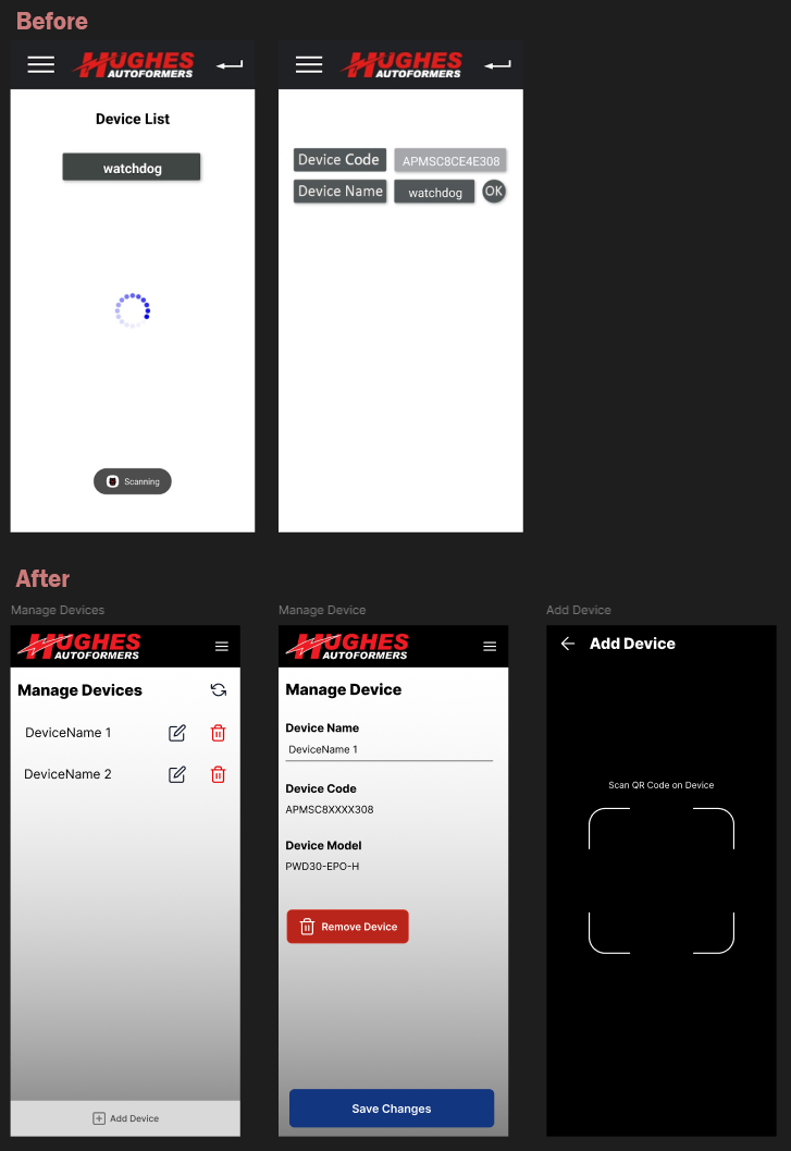 In the redesign, I implemented standardized UI patterns to remove guesswork. Using a familiar list view with dedicated edit and delete icons, the "Manage Devices" screen now offers immediate clarity on how to interact with the system. I also streamlined the setup process by introducing a QR code scanner for adding new devices, replacing manual entry with a fast, hardware-native solution that fits the "utility tool" nature of the app.